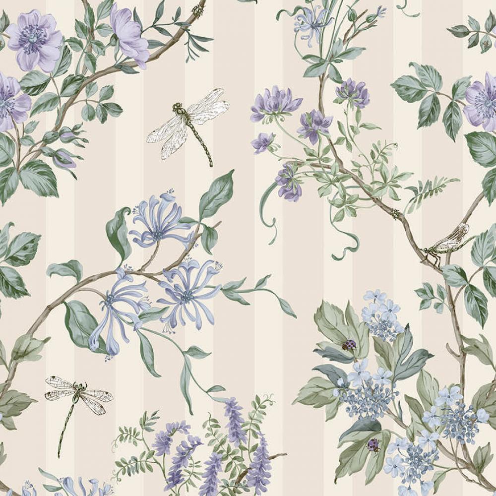 Цветочная дорожка на едва заметной полосатой основе со стрекозами, порхающими среди листвы и весенних полевых цветов.